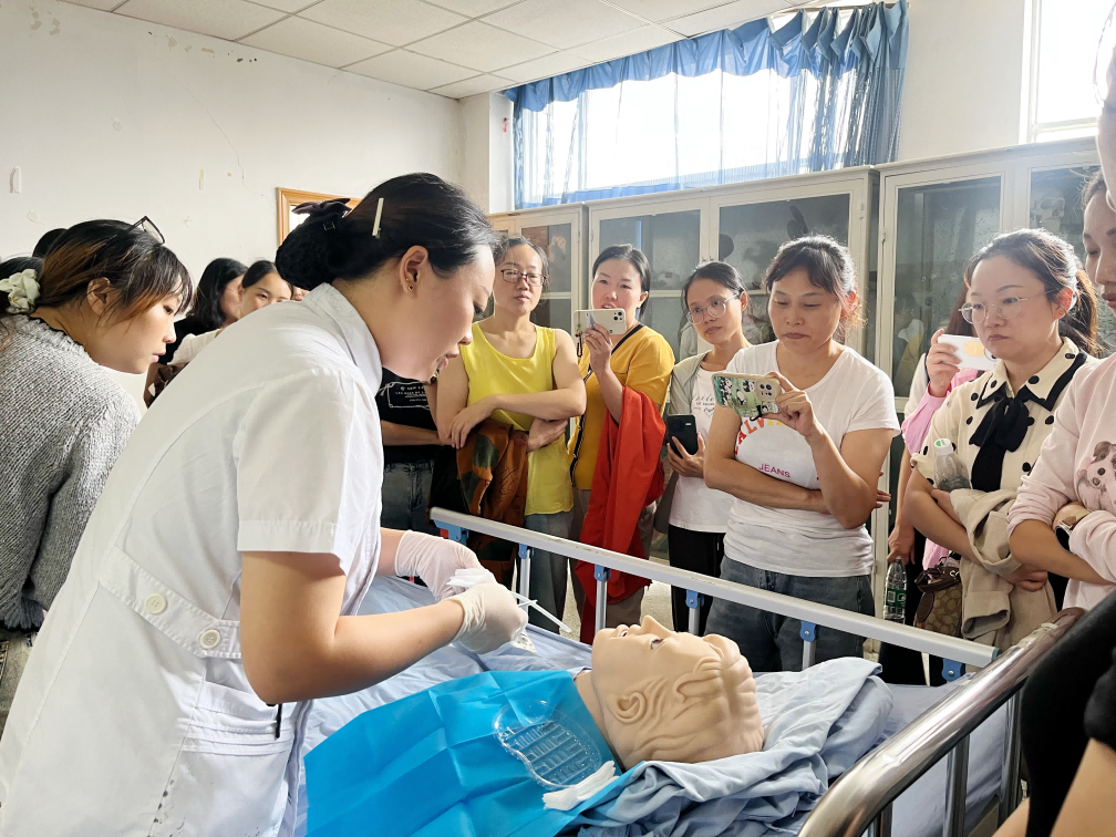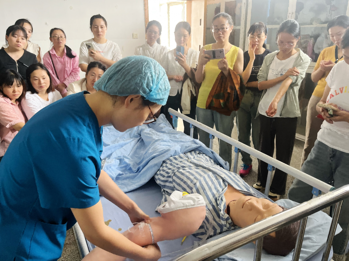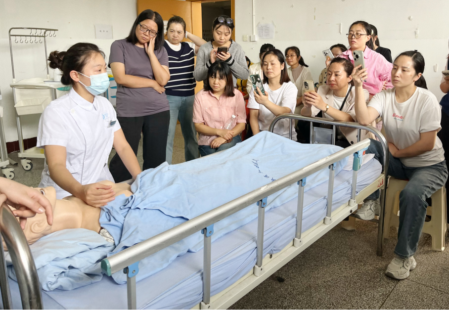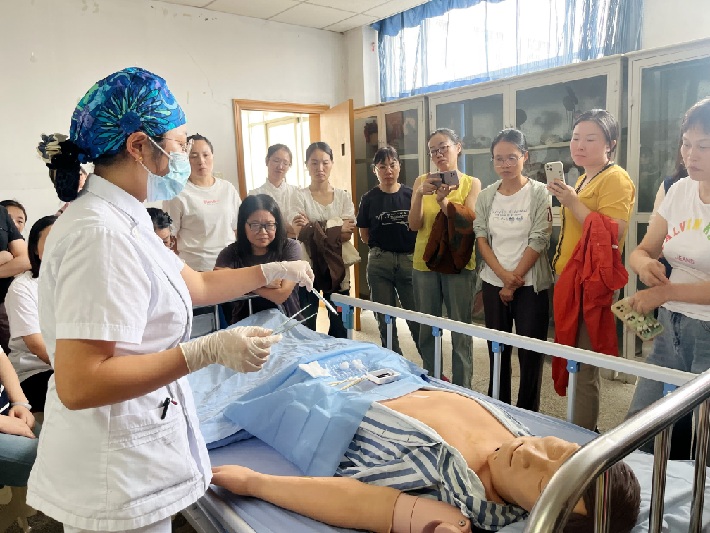 在操作培训环节,学员们将理论知识转化为实际操作能力。陈怀君现场示范清洁伤口及污染伤口的换药操作,手把手指导学员们掌握正确的换药技巧。静疗专科护士/新生儿科主管护师甯婵展示“PICC 置管的维护操作”,让学员们对 PICC 置管的维护有了更直观的认识。神经外科护士蔡静和唐苗分别进行留置胃管和女病人留置尿管的护理操作演示,江灿则再次展示通乳操作,每个操作环节都细致入微,学员们认真观摩,积极提问,现场学习氛围浓厚。