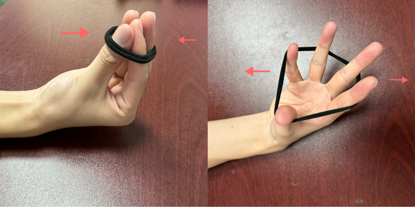方法:将橡皮筋绕绑在五根指头上,利用手指的力量向外撑开,感觉紧绷后维持5秒再放松。建议重复10次为一组,每天练习2-3组。