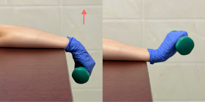 方法:一只手拿住一个轻质的哑铃(或500ml装水瓶),手臂伸直放于桌面,手部悬空,手掌朝下,手握哑铃用手腕的力量抬起手背。每侧做三组,每组10次。这个动作能强化腕部肌肉,预防鼠标手。