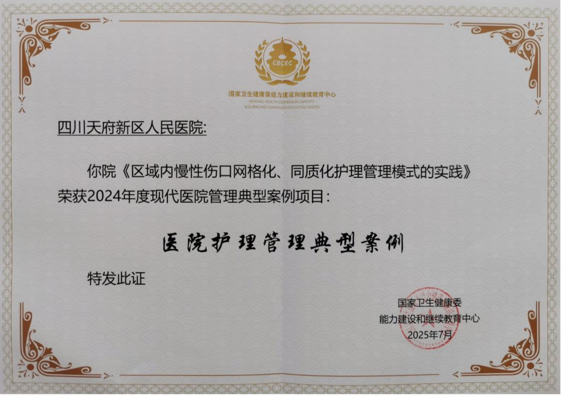2025年9月26日至28日,由国家卫生健康委能力建设和继续教育中心与海南省卫生健康委联合主办的“第十届中国现代医院管理能力建设与发展大会”在琼海市隆重召开。会上,四川天府新区人民医院护理团队凭借在护理管理创新、伤口管理质量提升与区域协同发展等方面的突出成果,受邀参会并正式领取“2024年度中国现代医院护理管理典型案例”荣誉证书,国家级权威平台再次见证“天府护理”的硬核实力!
