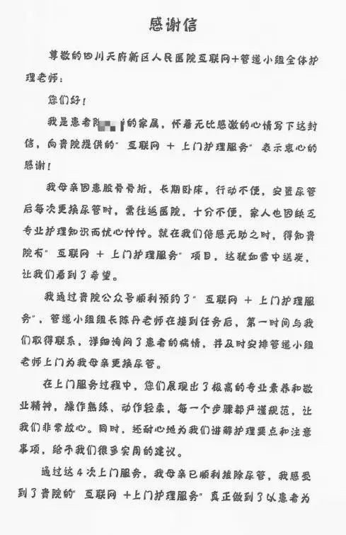 近日,四川天府新区人民医院收到了一封来自患者家属的手写感谢信,字里行间表达出对“互联网+上门护理服务”的认可与感激。这封信不仅是对护理团队专业能力的肯定,更是对医院创新服务模式的鼓励。