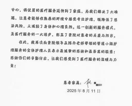 患者的认可,是我们前进的动力。收到这封感谢信后,管道小组的护理老师们既感动又欣慰。陈丹表示:“患者的满意是我们最大的追求,我们会继续努力,让更多有需要的家庭享受到便捷、专业的护理服务。”