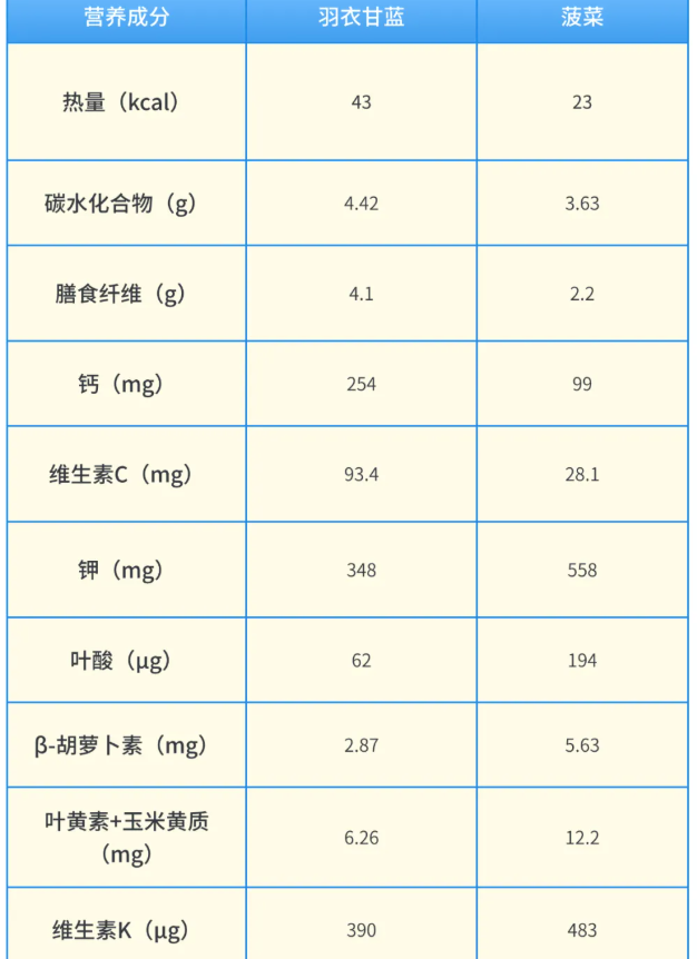 羽衣甘蓝胜在:维生素C(绝对优势)、膳食纤维(更丰富)、钙(含量更高且吸收可能更好)。